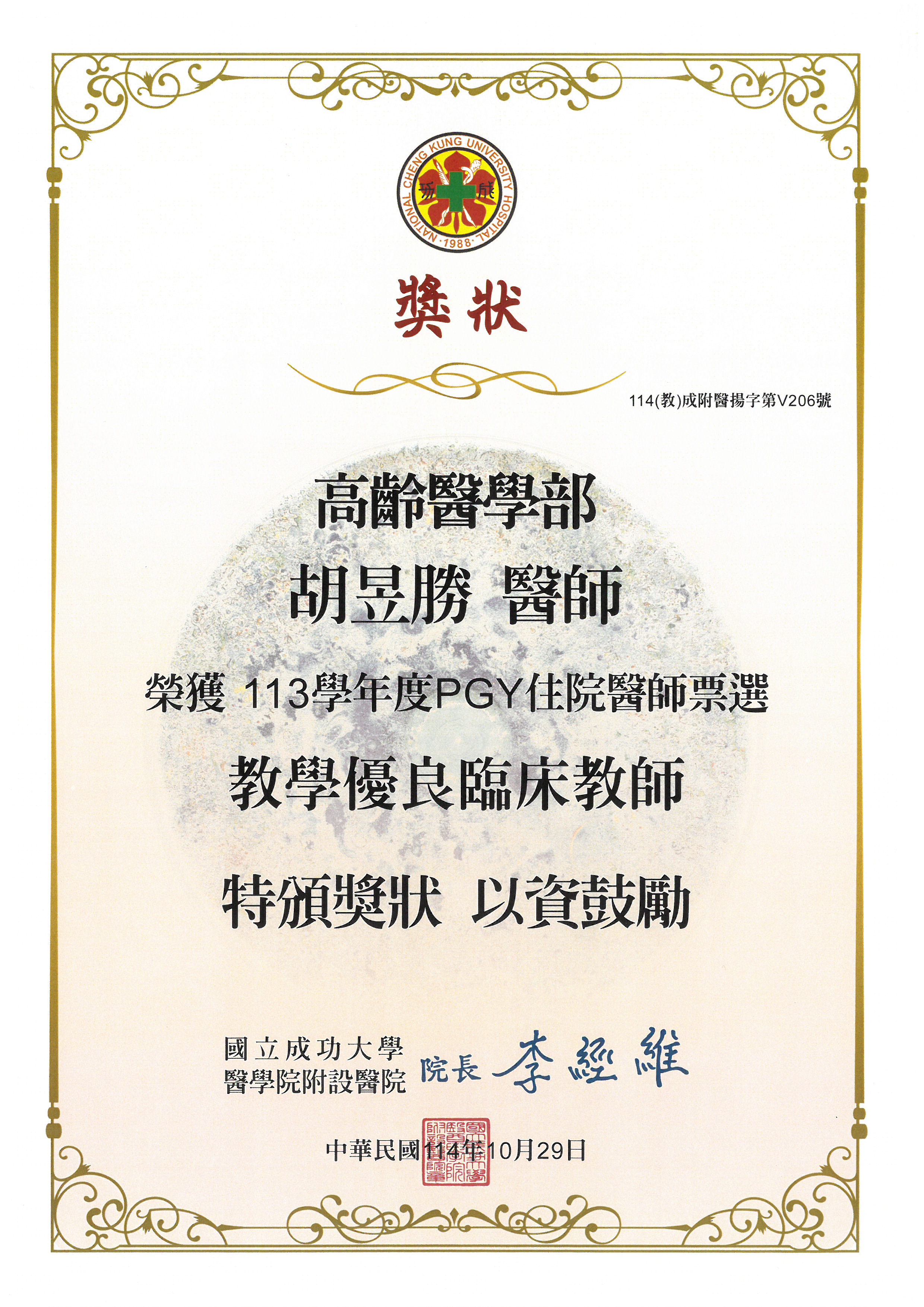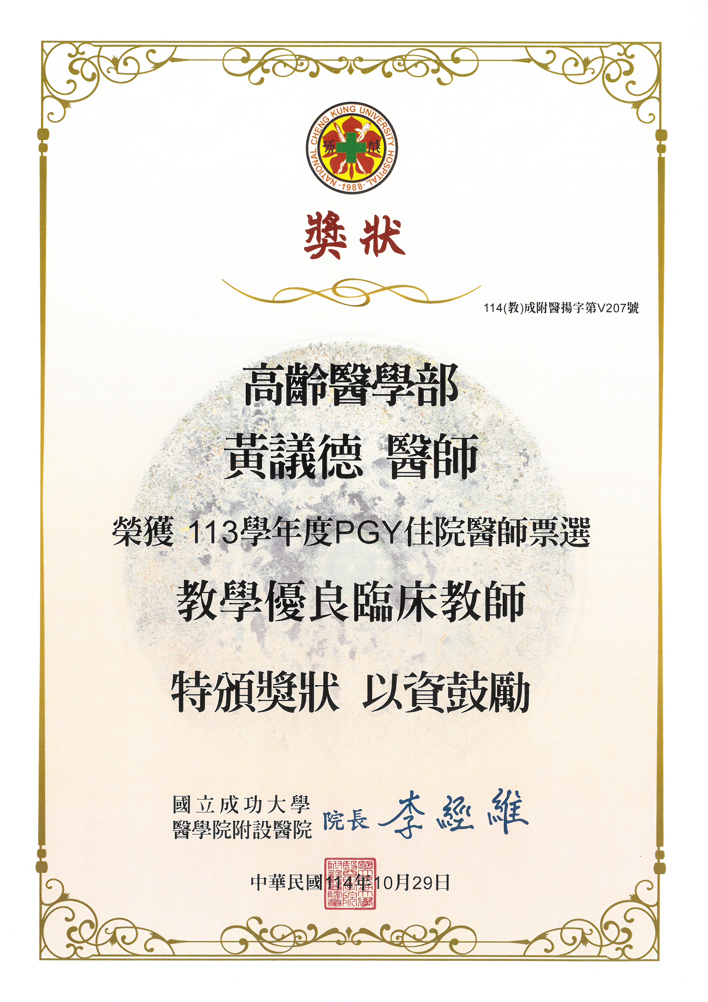 [恭賀]黃議德、胡昱勝醫師 榮獲113學年度PGY醫師票選之優良教師